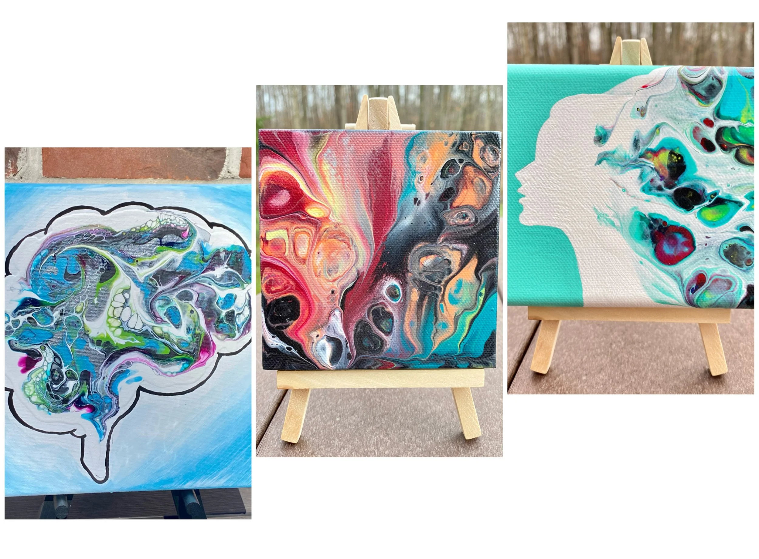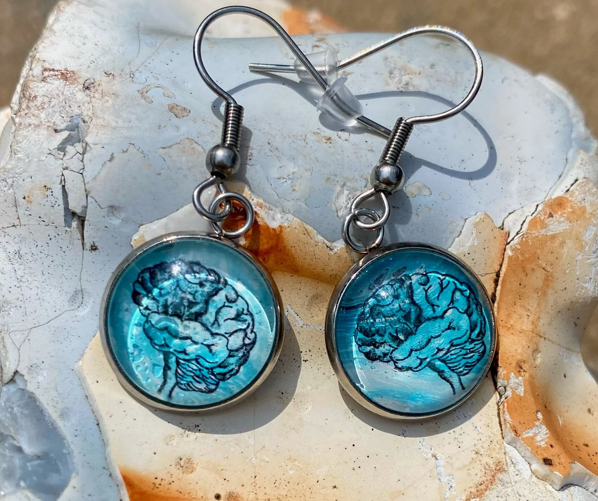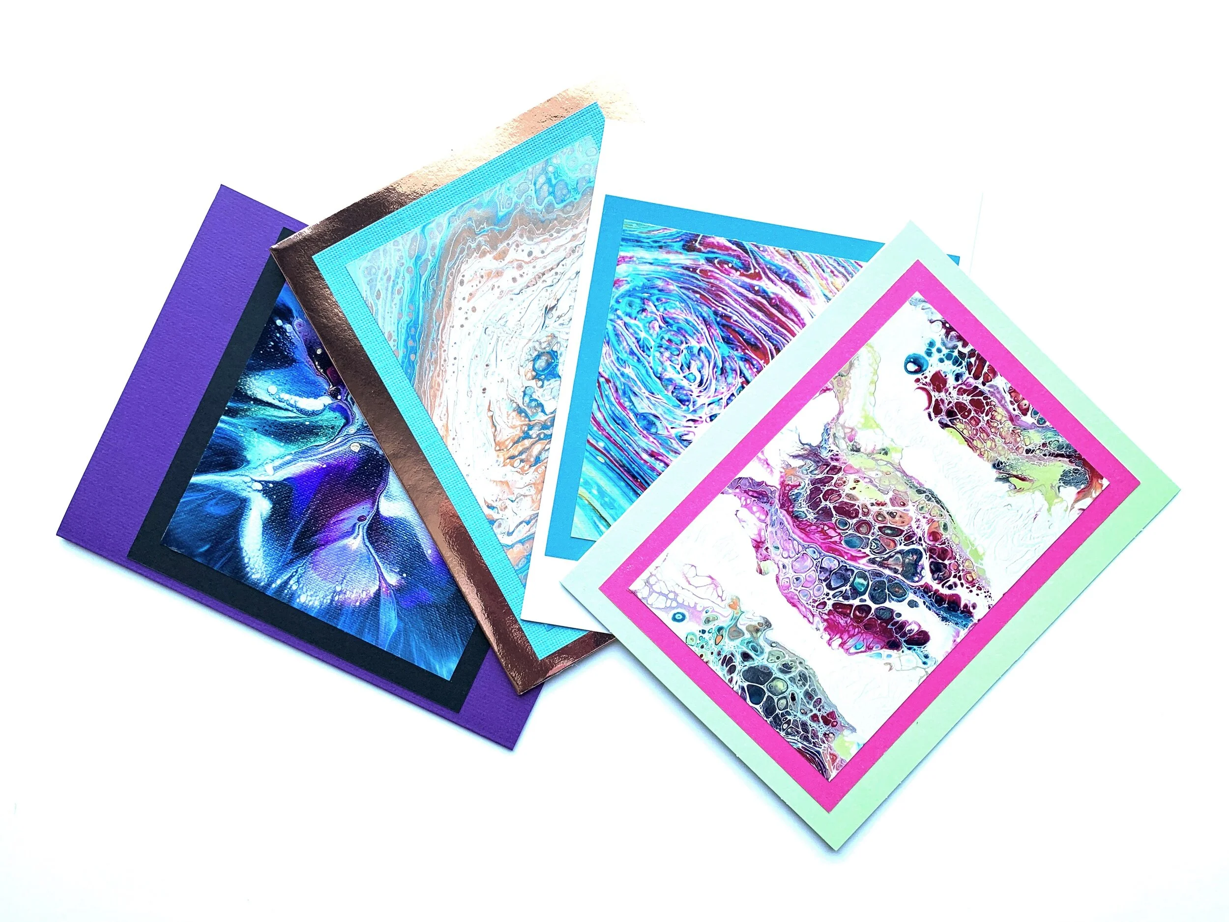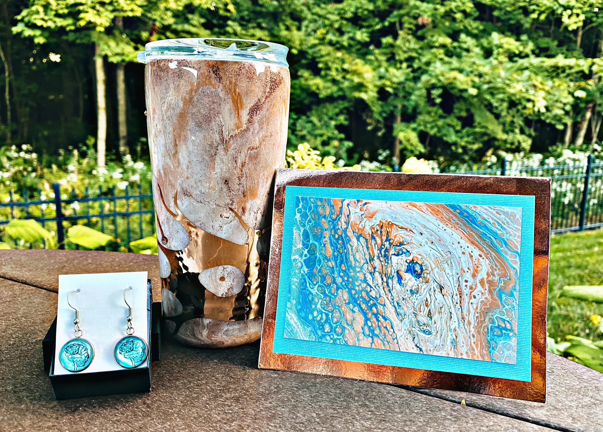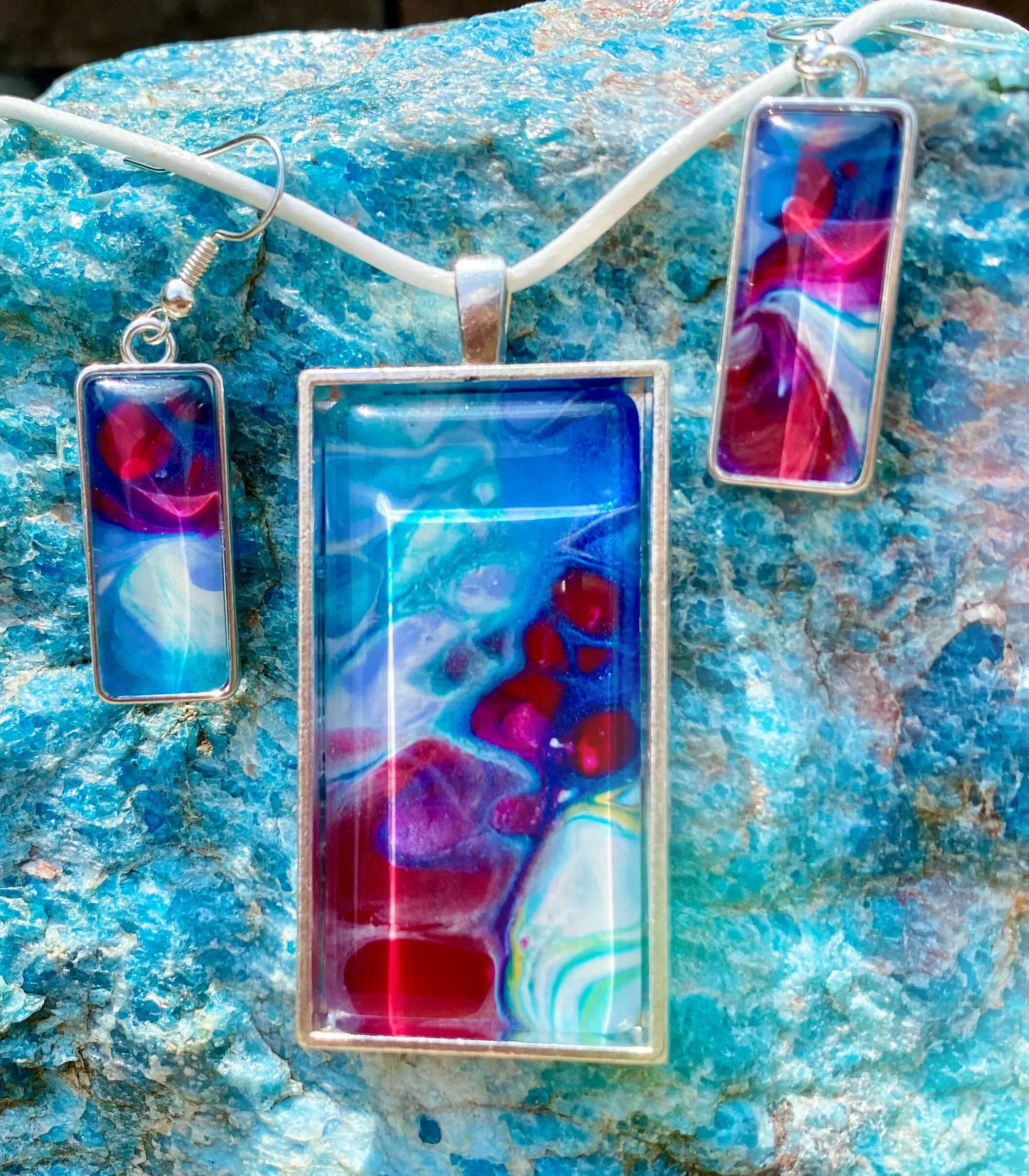 One-of-a-kind pieces of jewelry are handmade using an acrylic pour painting technique with a glass cabochon overlay.